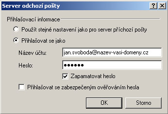 V otevřeném okně zaklikněte možnost Přihlašovat se jako a zadejte do polí opět celou emailovou adresu a heslo. Dále také zaškrněte Zapamatovat heslo, aby jste při každém odesílání emailu nemuseli heslo znovu zadávat. Poté stiskněte tlačítko OK, tím se toto okno zavře a dostanete se do předchozího okna. Tam opět stiskněte tlačítko OK. |